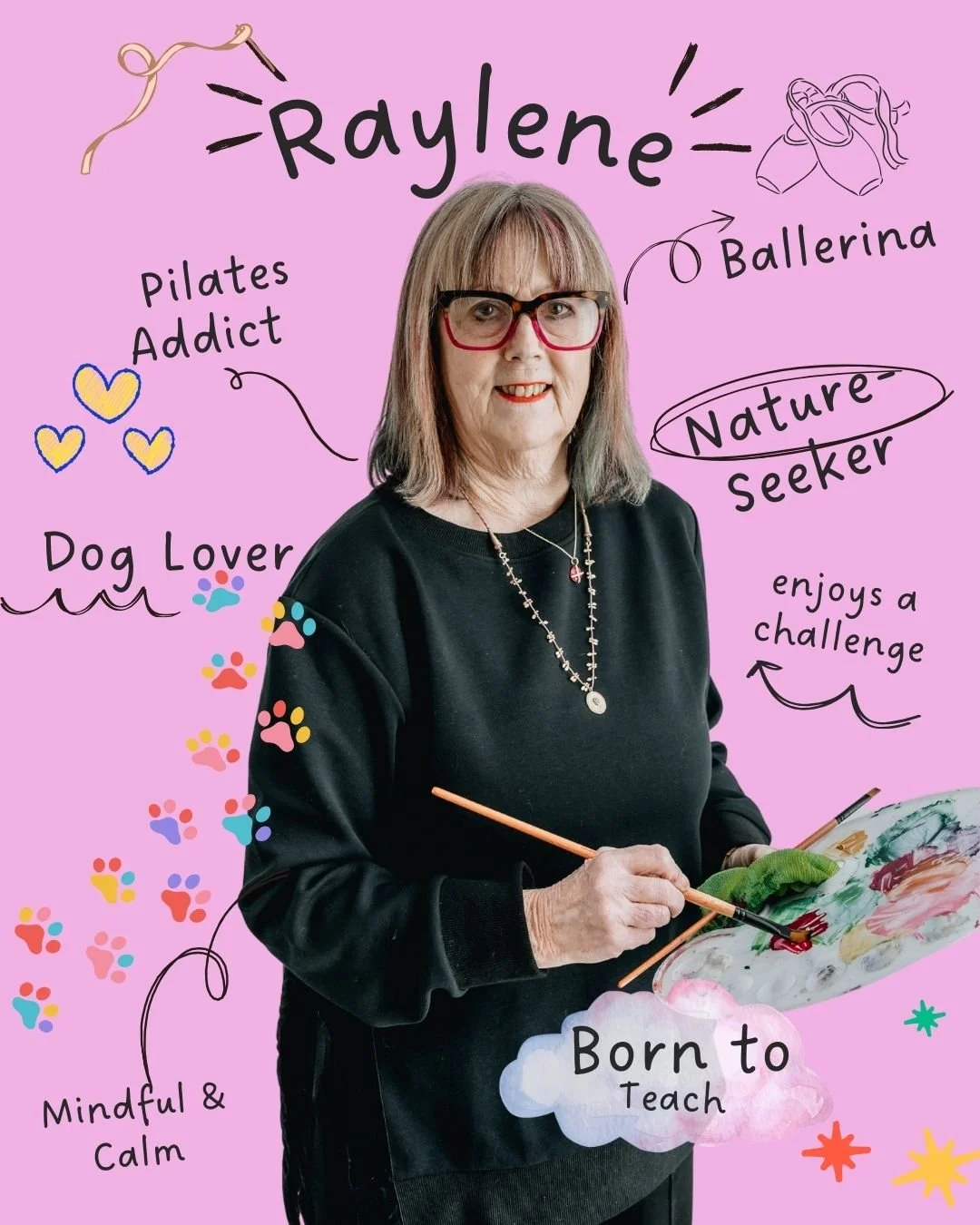 She describes herself as inventive, resourceful, and creative. Shelley loves travel, grandkids, and anything arty — but her favourite class to teach is collage (because it draws on every area of art!). Fun fact: she was born under hypnosis — which might explain her calm, collected nature .